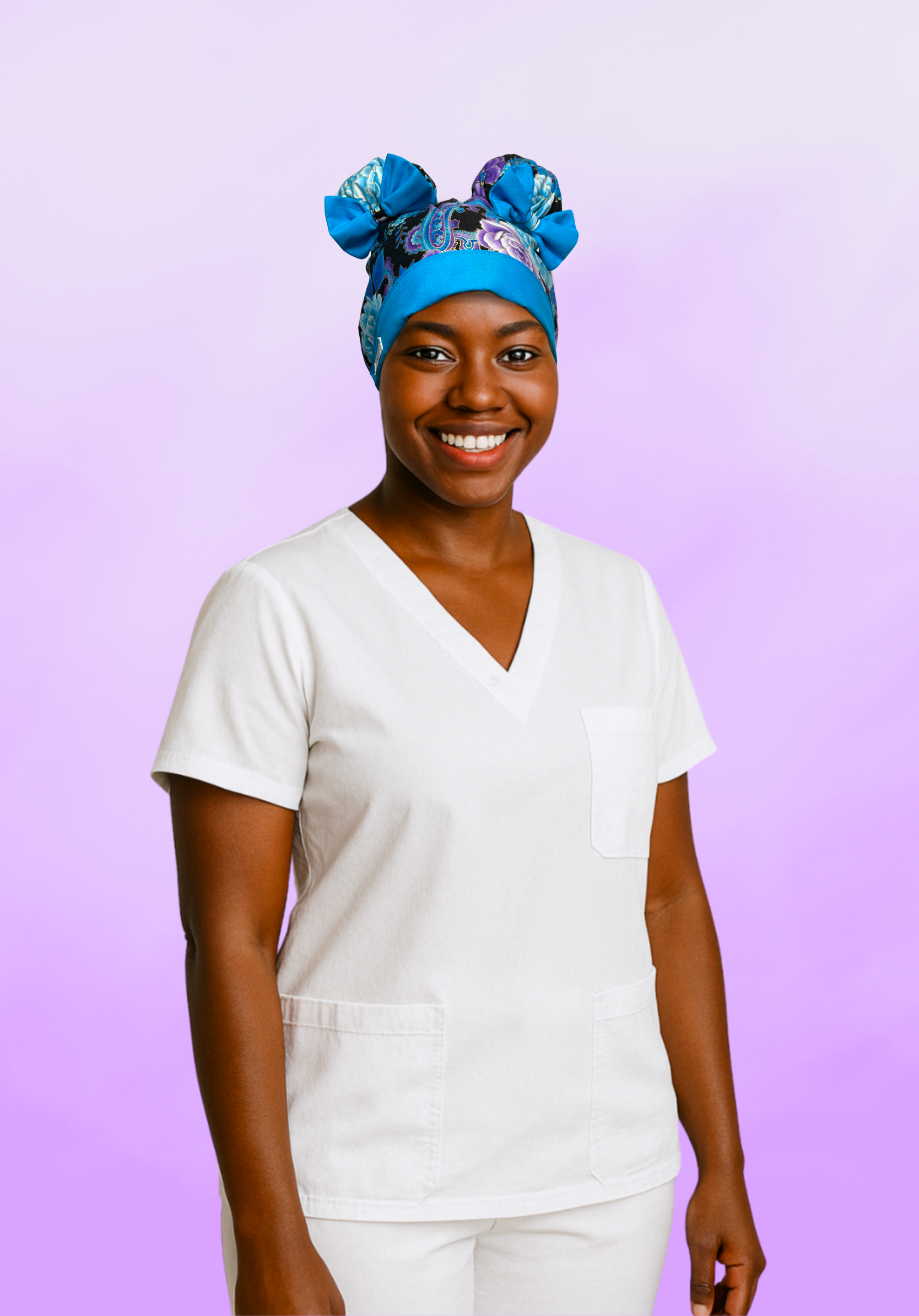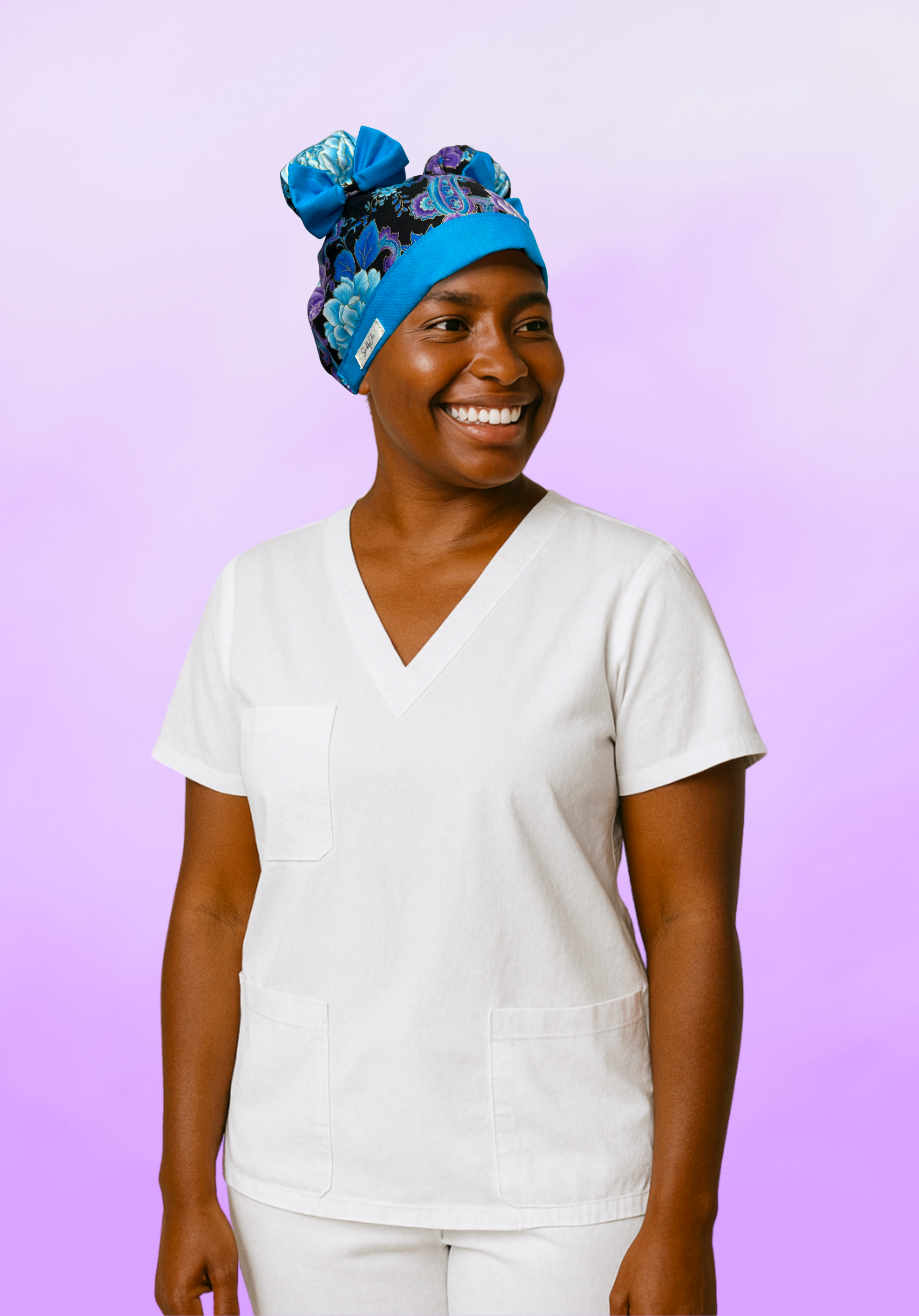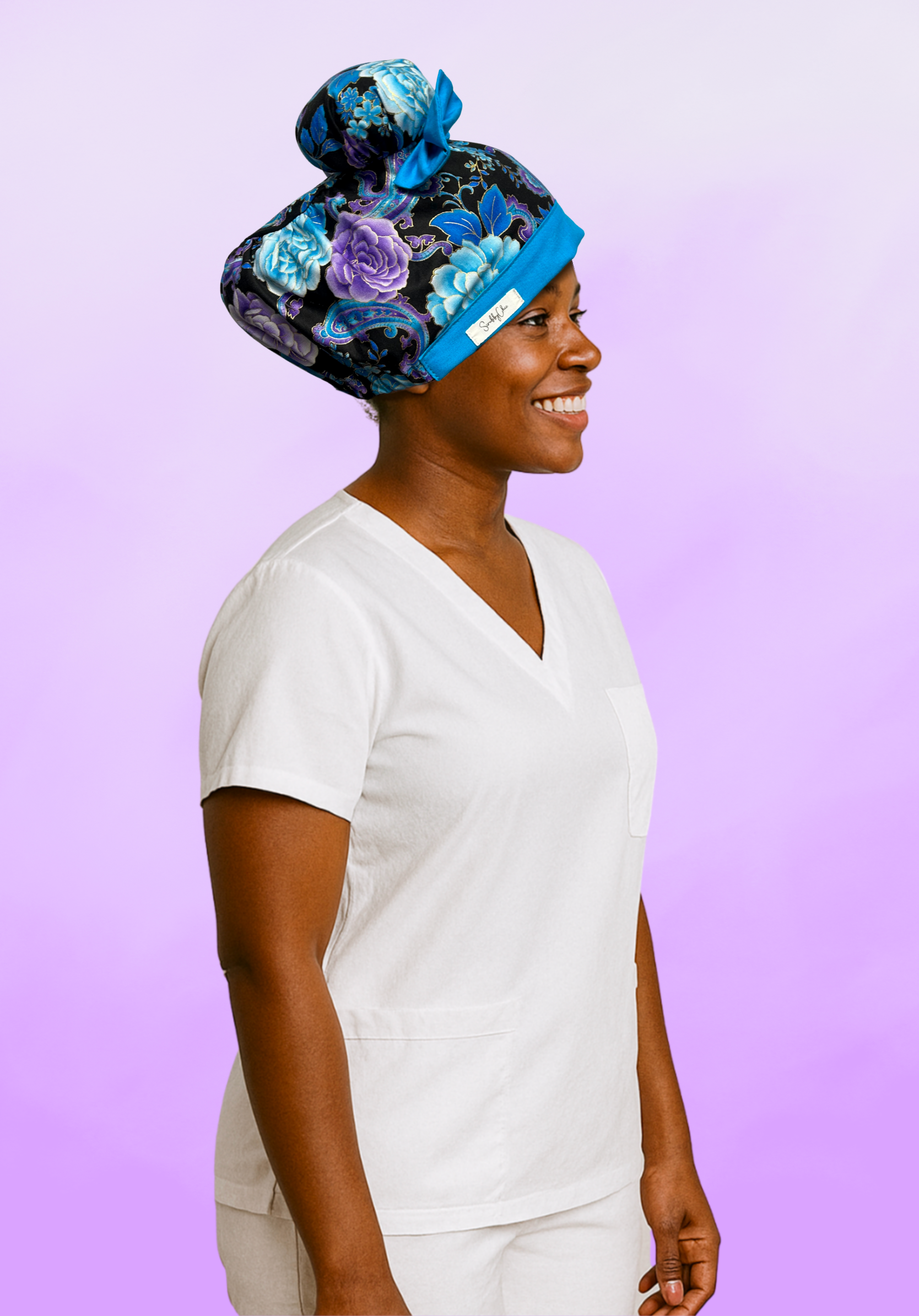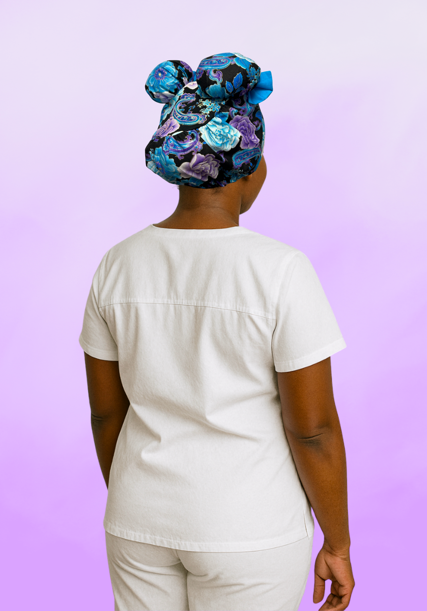 Blue Cotton Paisley ScruBunz - featuring purple & blue flowers on black background