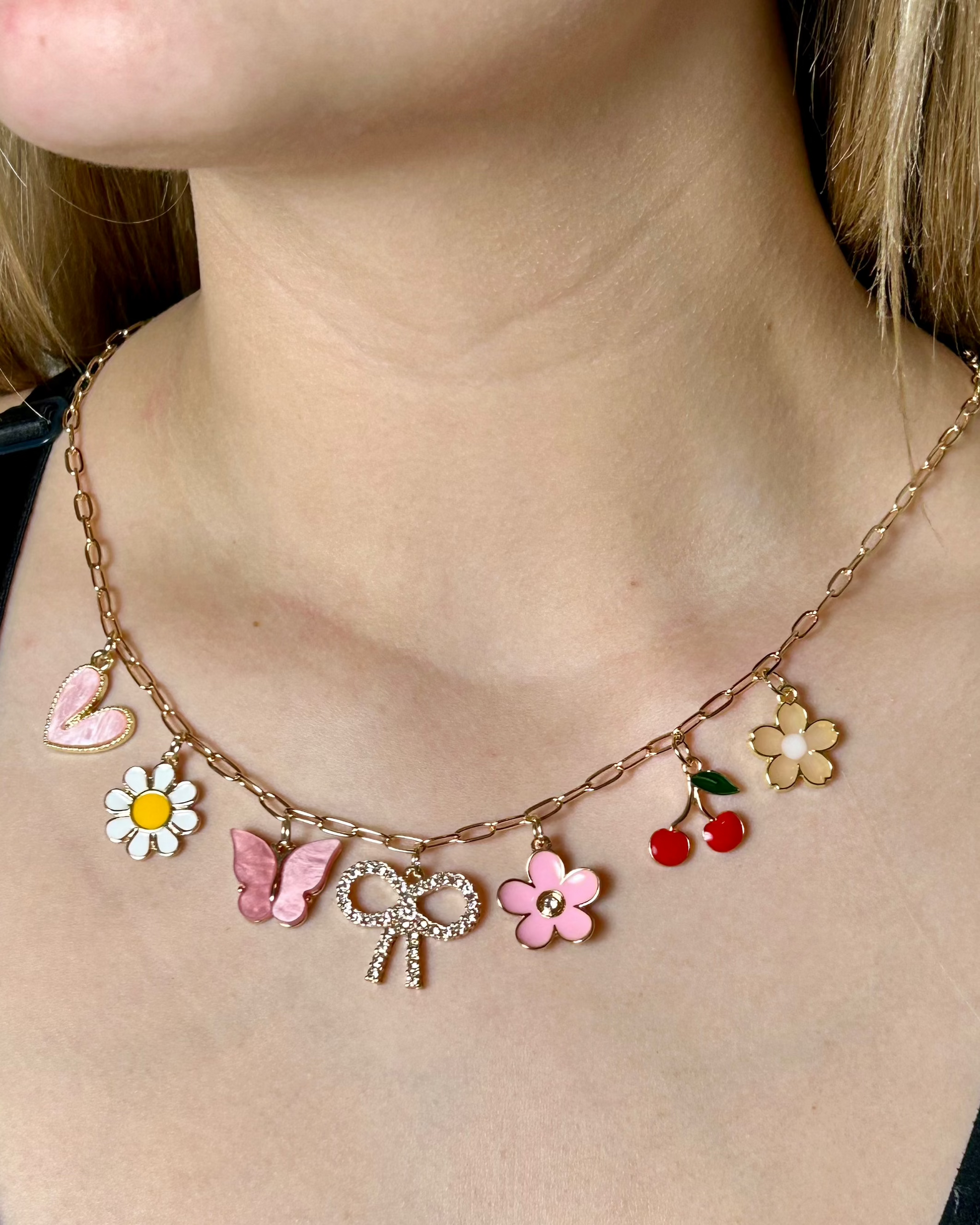 Multi-charm necklace featuring a sweet mix of charms—bow, heart, flower, and butterfly—perfect for adding a playful yet elegant touch to your everyday style.