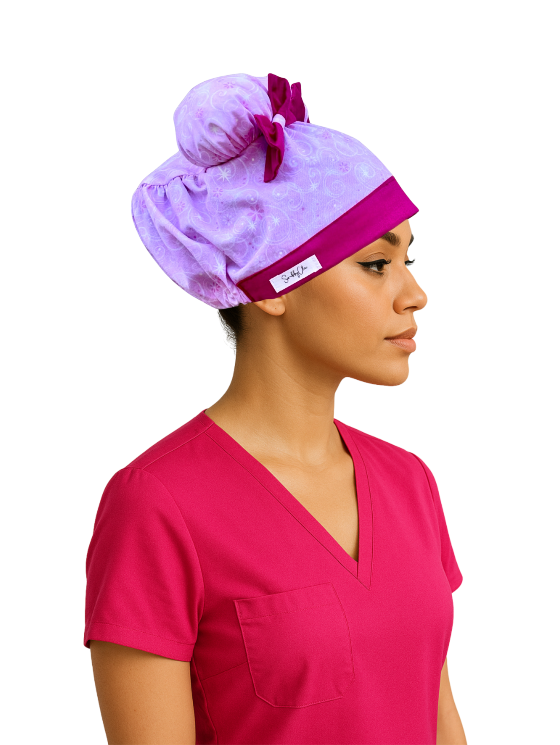 Handmade scrub cap for female nurses — this Breast Cancer Awareness ScruBunz cap shines with strength and hope. Featuring a soft pink background with subtle ribbon-inspired swirls and finished with bold fuchsia accents, this design is a beautiful way to honor survivors, fighters, and supporters.