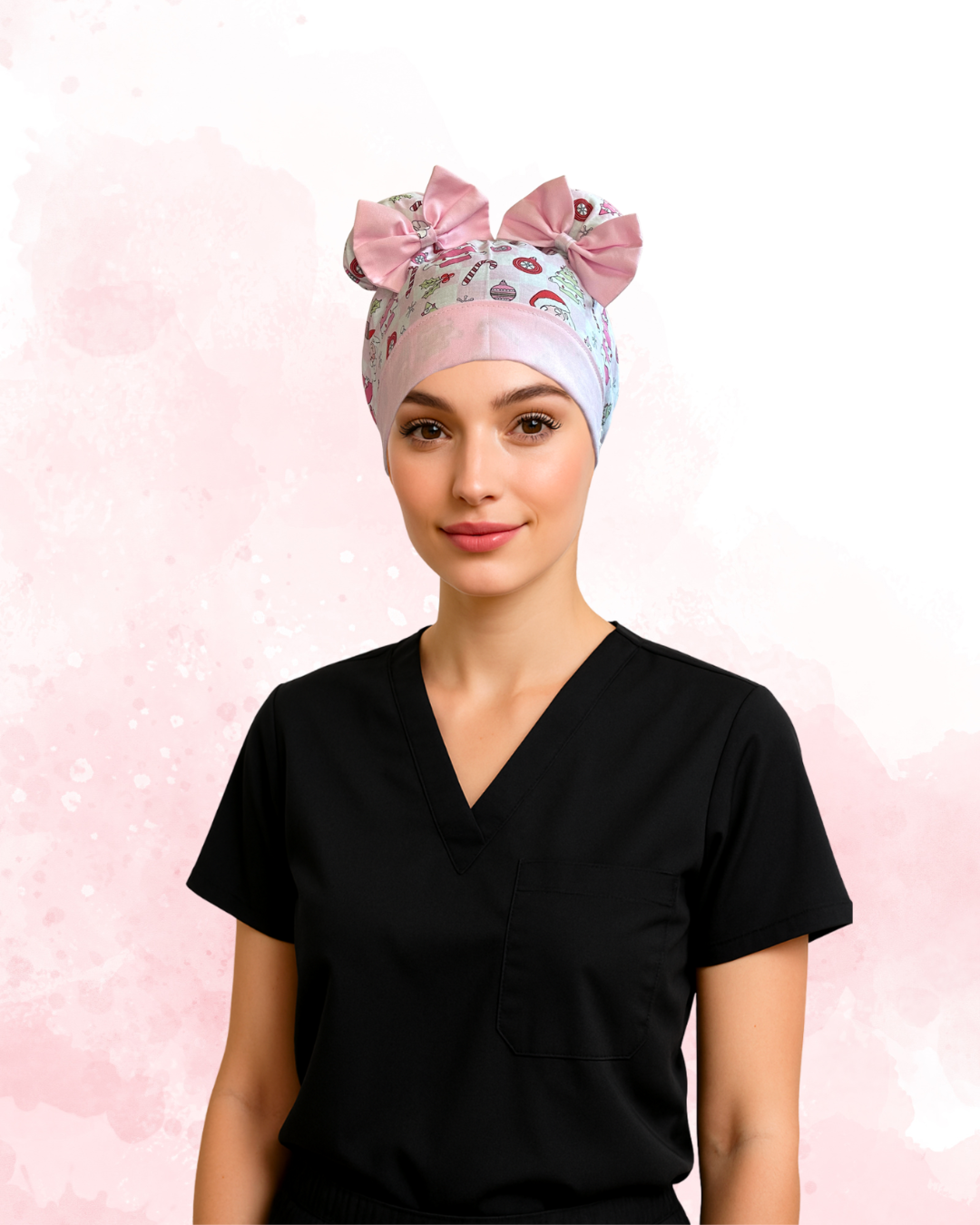 Handmade scrub cap for female nurses featuring a whimsical holiday print of candy canes, ornaments, and cheerful pink Christmas trees against a frosty pastel background. Finished with soft pink bows on each bun, this ScruBunz adds a touch of festive magic to every shift while keeping you stylish and comfortable.