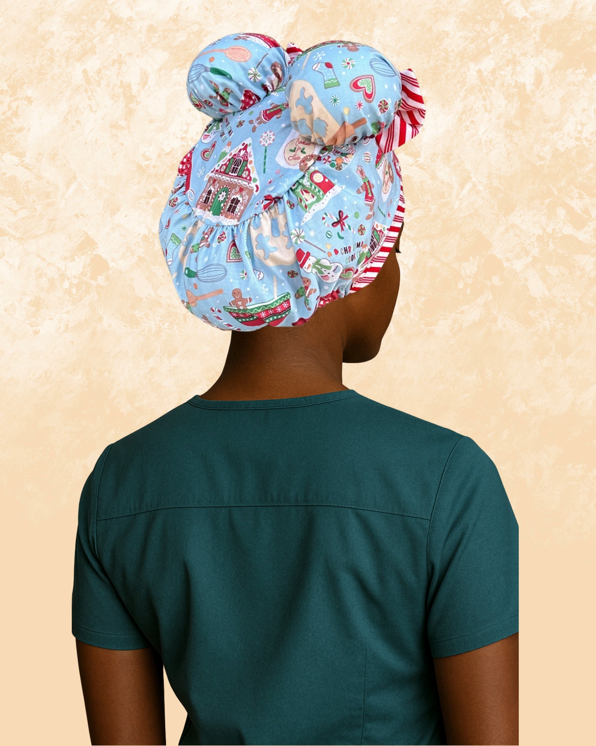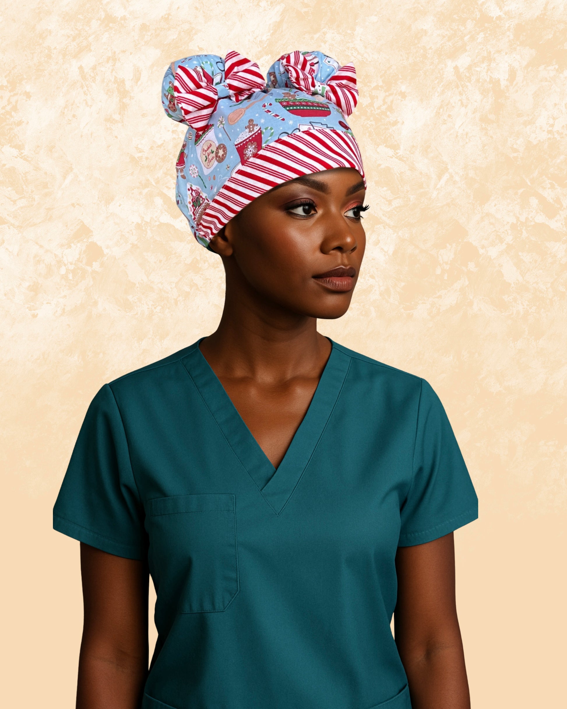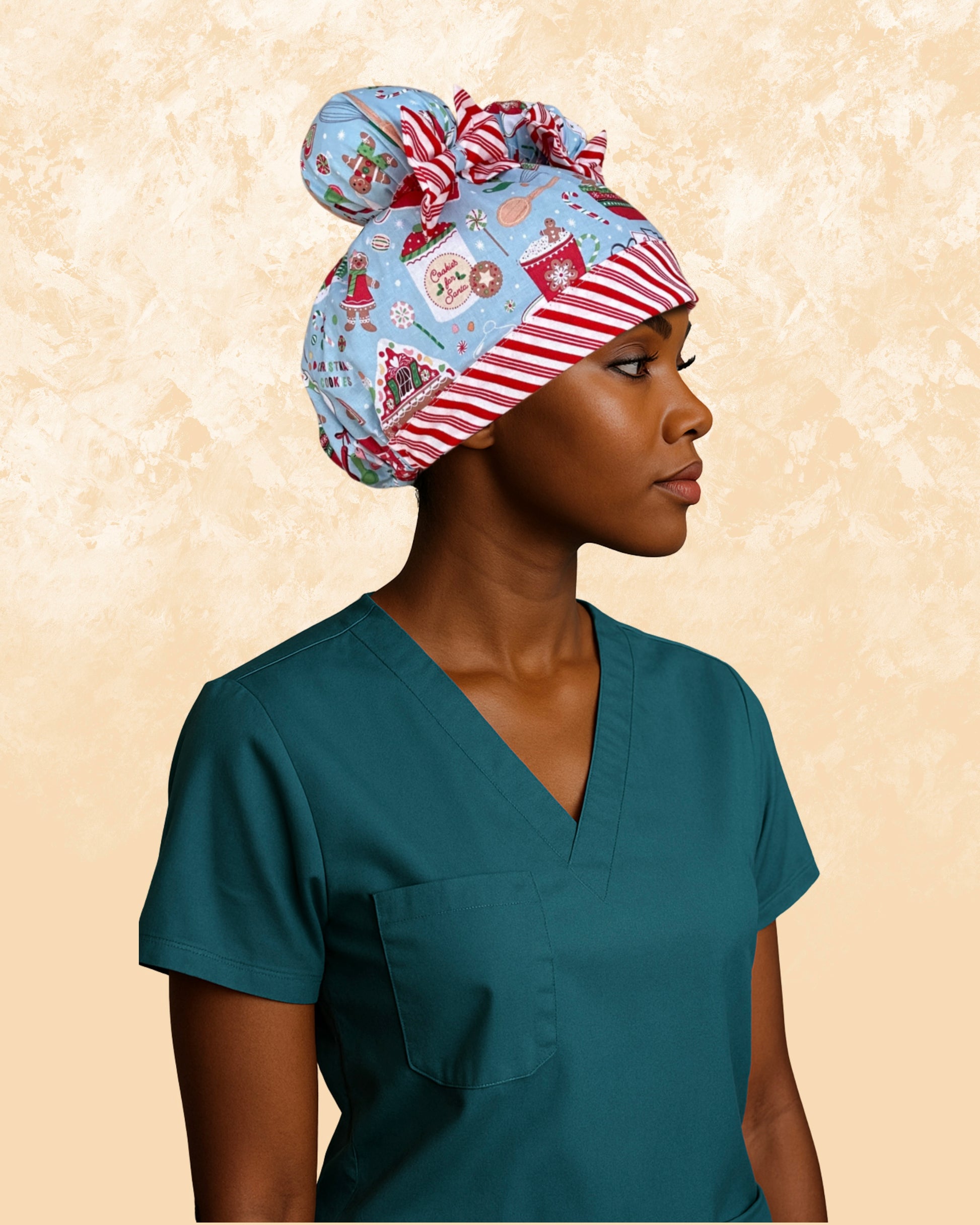 The Cookies for Santa ScruBunz is the sweetest way to celebrate the season! This festive scrub cap features cheerful gingerbread cookies, holiday baking tools, and our signature double space buns — perfectly stuffed for style and spirit. Whether you're circulating in the OR or handing out meds with sugarplum energy, this cap is your go-to for spreading cheer.