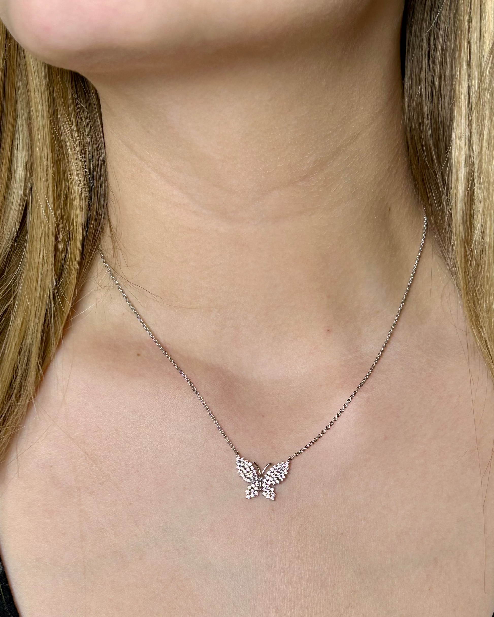 Silver toned crystal butterfly necklace, featuring delicate winged details and shimmering stones—perfect for adding a graceful, feminine sparkle to any outfit.