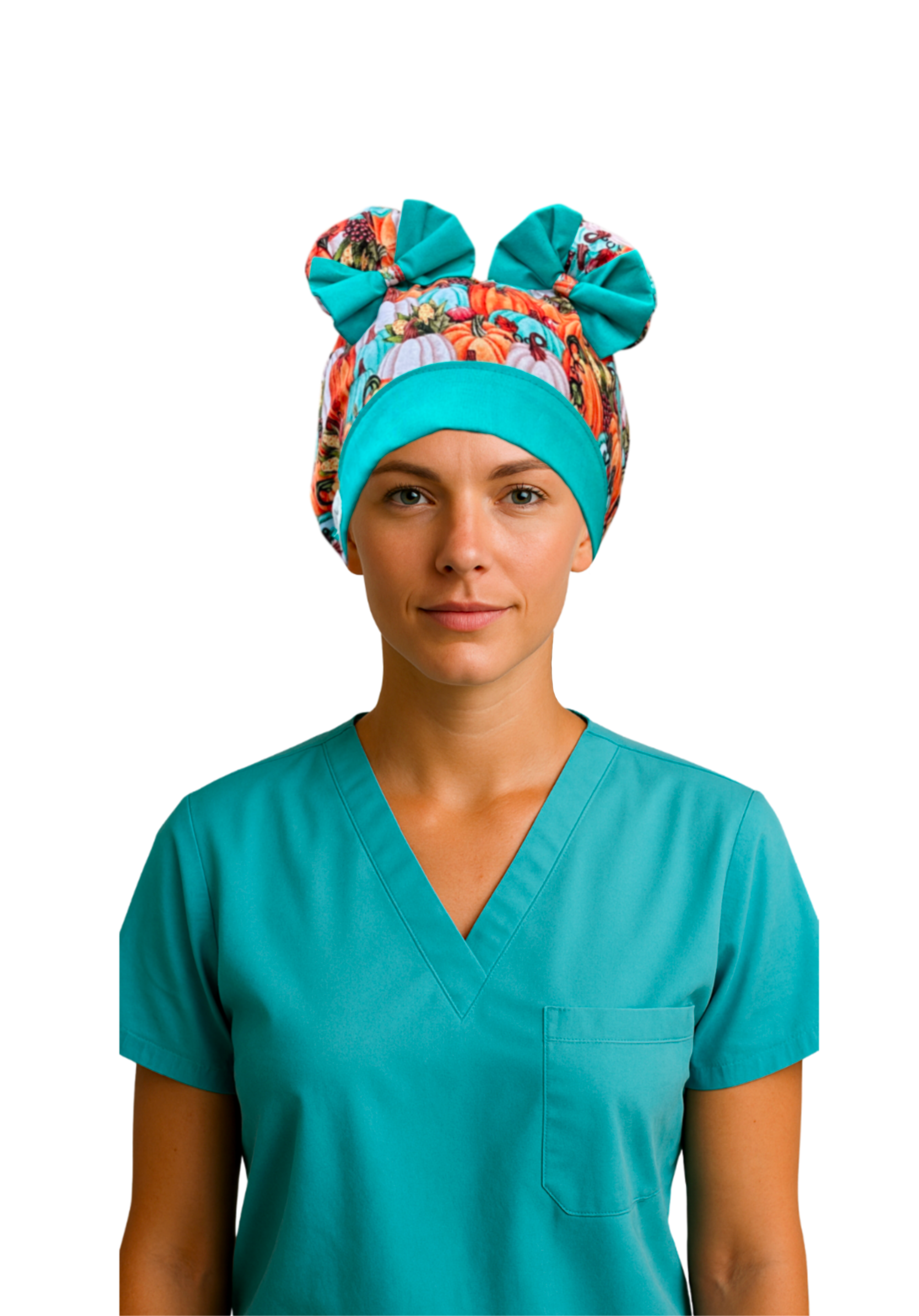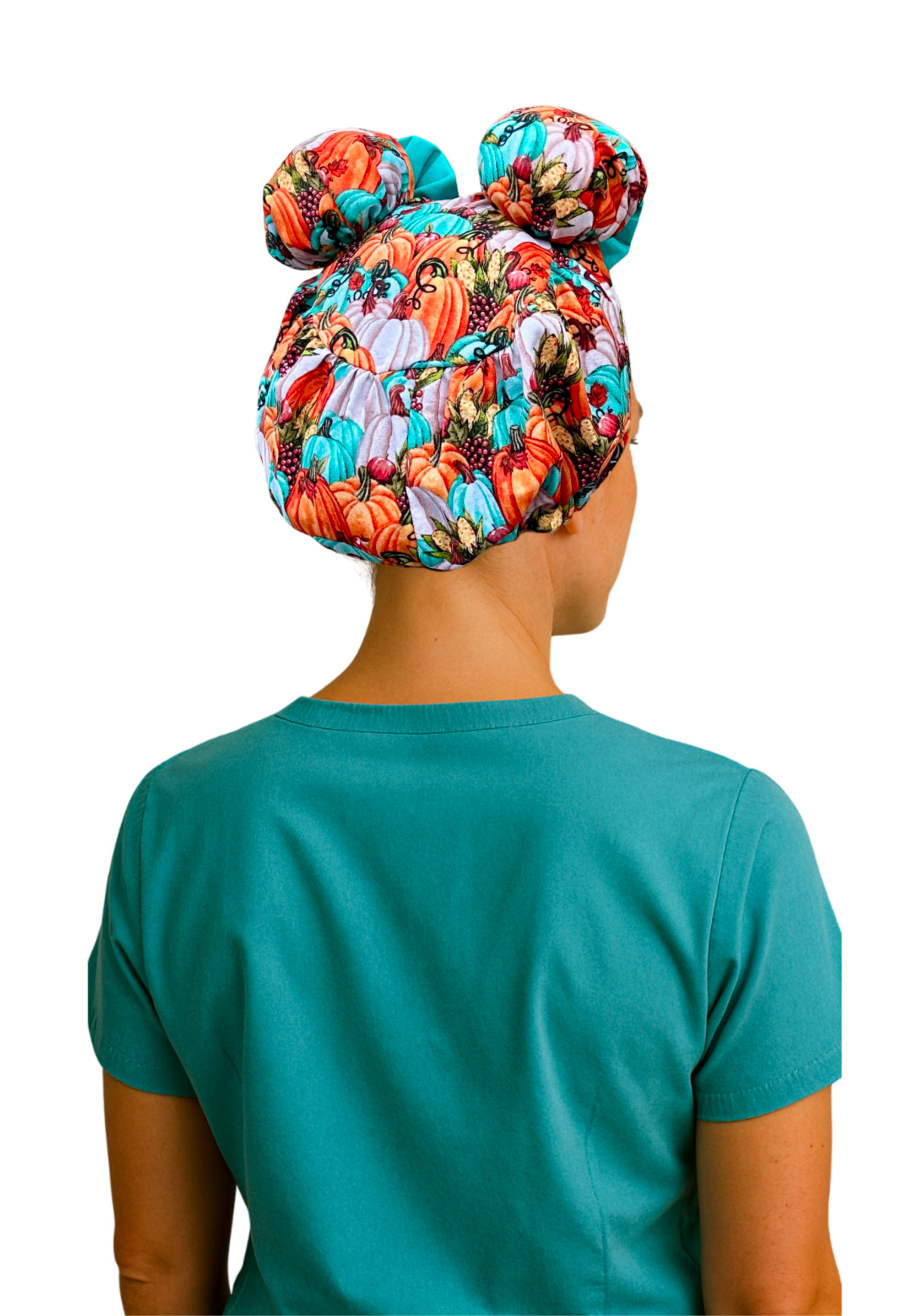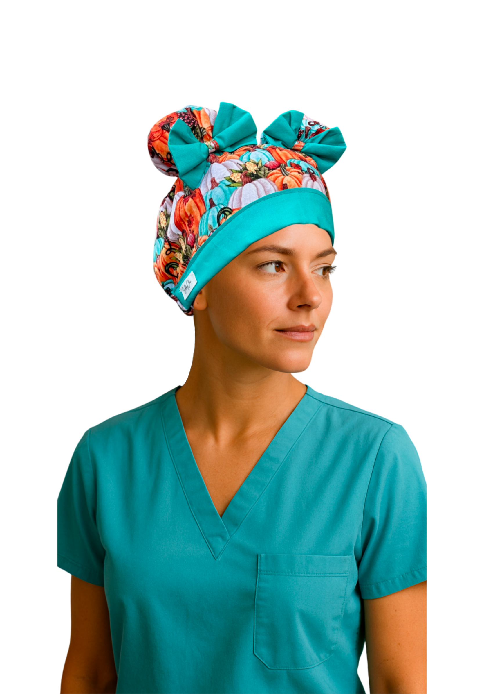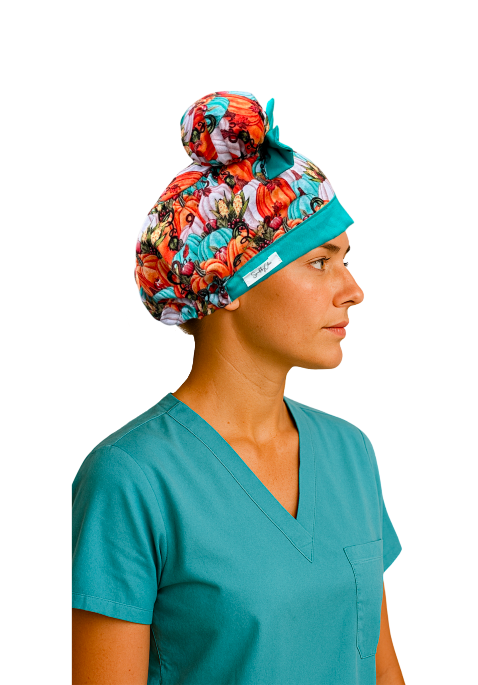 Handmade scrub cap for female nurses featuring stacked pumpkins in orange, white, and teal with green vines and fall vibes — a cozy, autumn-inspired design. Crafted from soft, breathable fabric to add a fun, cheerful vibe to your workday.