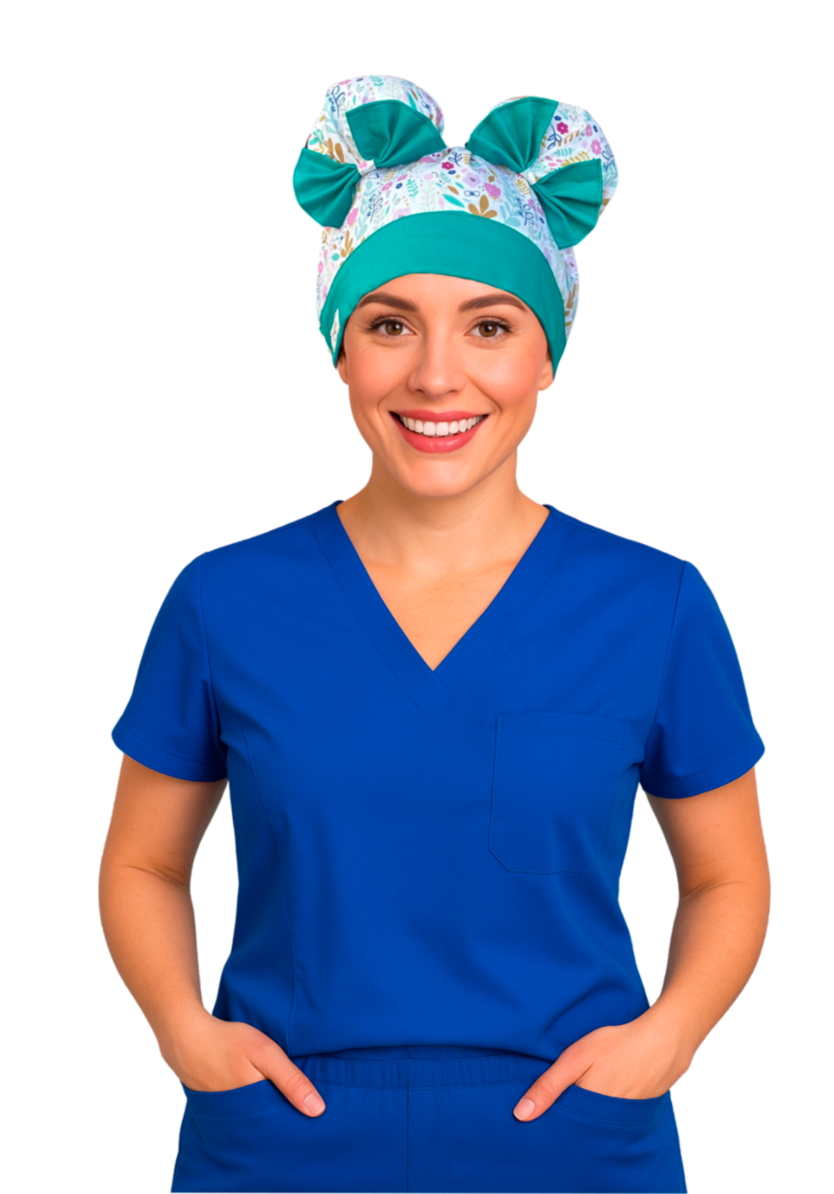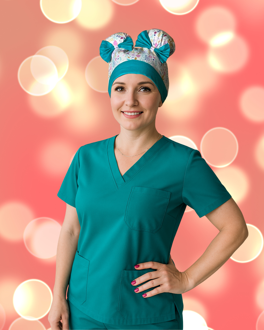 Handmade spring floral scrub cap for female nurses. Soft pinks, teal, blue, and gold details create a fresh, charming look with comfort in every stitch.