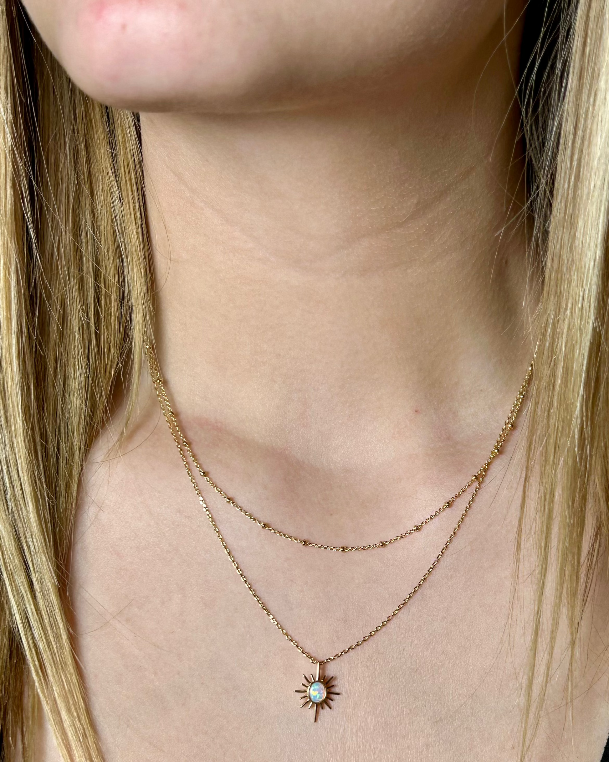 Gold-plated radiant starburst opal pendant, featuring a shimmering center stone and delicate detailing—perfect for adding a touch of celestial charm to any look.