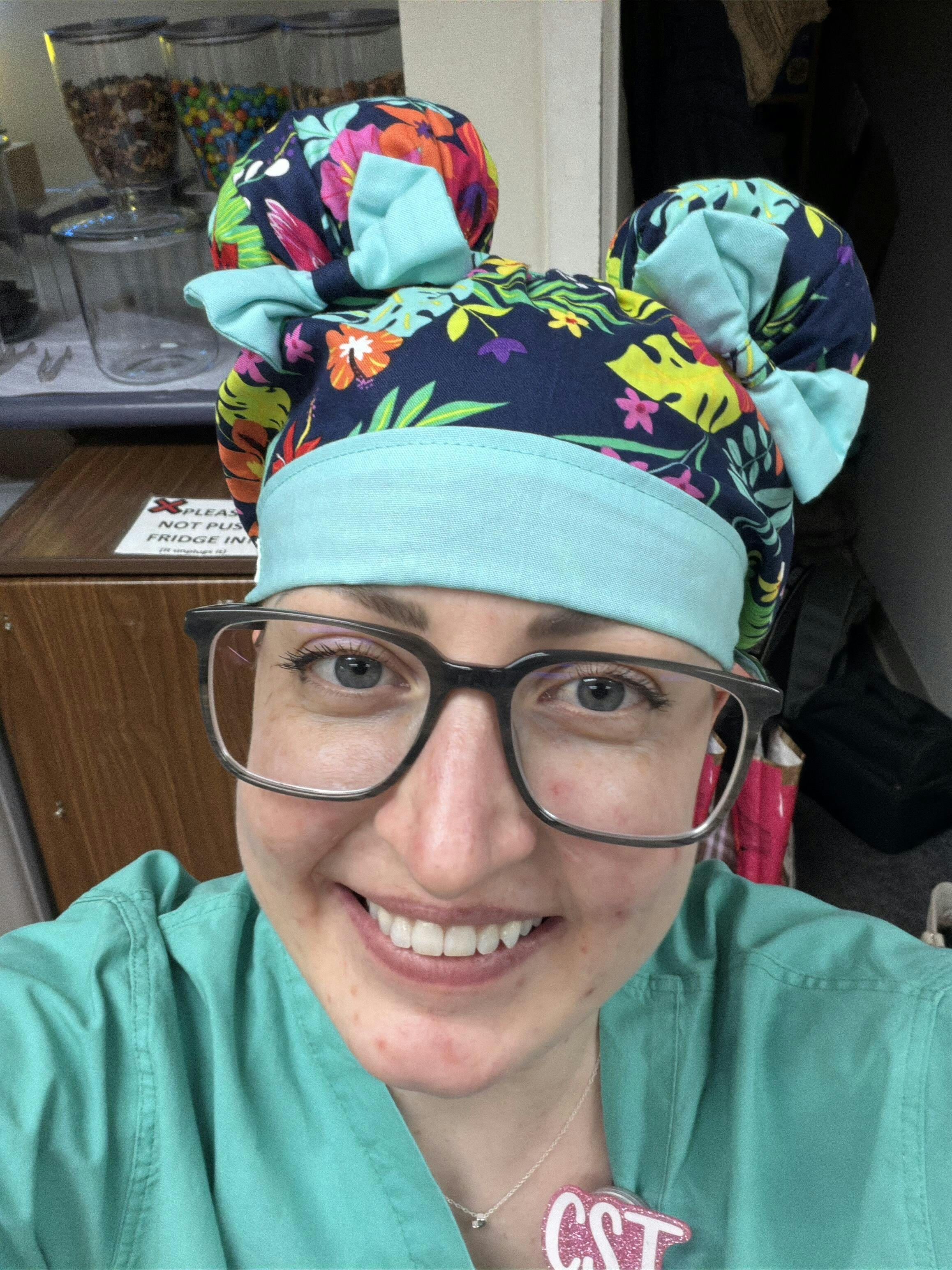 Handmade scrub cap for female nurses featuring a vibrant tropical design with flamingos, pineapples, and lush jungle leaves. This playful island-inspired print is paired with soft mint bows on each bun, bringing a cheerful and sunny vibe to every shift.